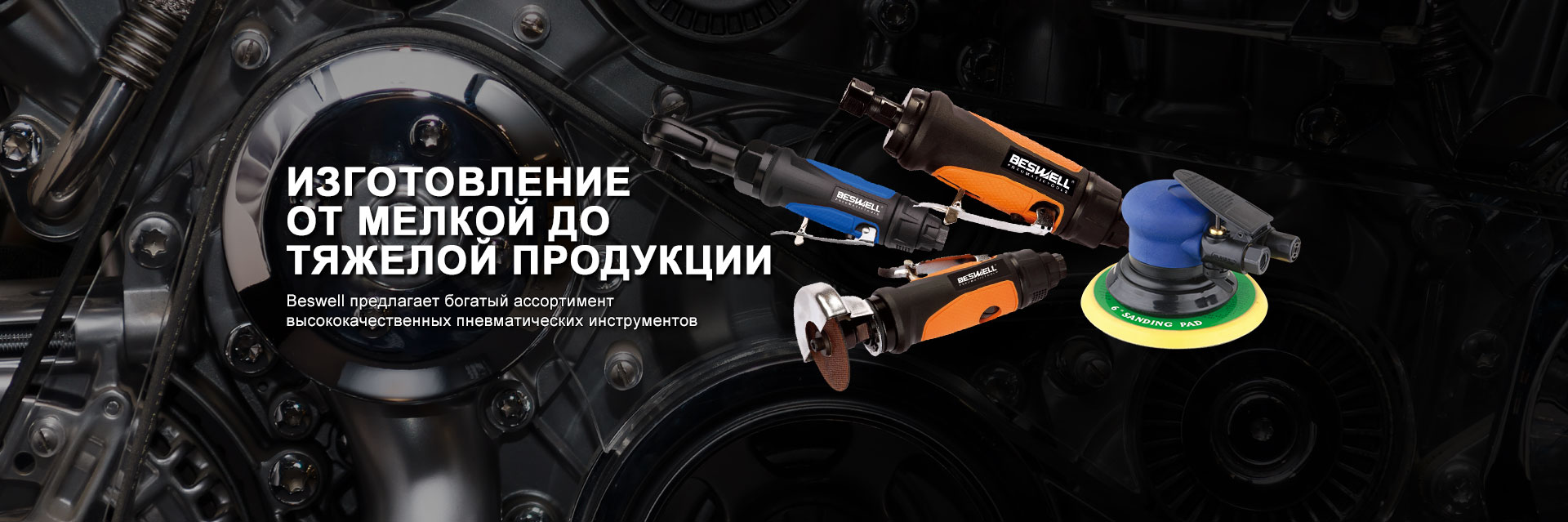 Компания Beswell основана как производитель и экспортер пневматических инструментов, аккумуляторных инструментов и другой соответствующей продукции, предназначенной для стандартных и особо тяжелых условий и применяемой в промышленной и автомобильной отраслях. Ассортимент продукции подразумевает самые разные инструменты с CE-сертификацией, а также такие приспособления как пневматические ключи, трещотки, дрели, шлифовальные машинки, молотки, ленточно-шлифовальные машинки, винтоверты, краскопульты, заклепочники, пневматические компрессоры и т. д.Beswell предлагает продукцию, разработанную и изготовленную для удовлетворения самых жестких требований. Для гарантии длительного срока службы продукция прошла тщательные испытания и проверку